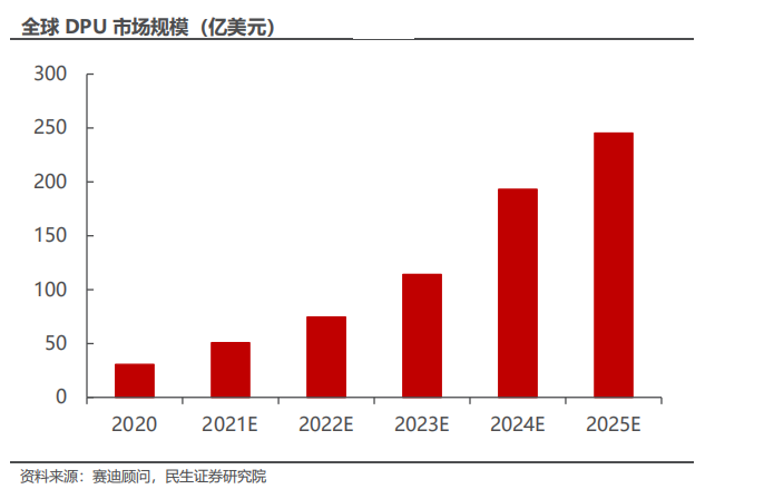 上游:EDA、IP 核、制造、封测;中游:云厂商、芯片厂商;下游:云厂商、电信领域。根据赛迪顾问数据,2020 年全球 DPU 产业市场规模达30.5 亿美元,预计到 2025 年全球 DPU 产业市场规模将超过 245.3 亿美元,期间 CAGR 高达 51.73%。