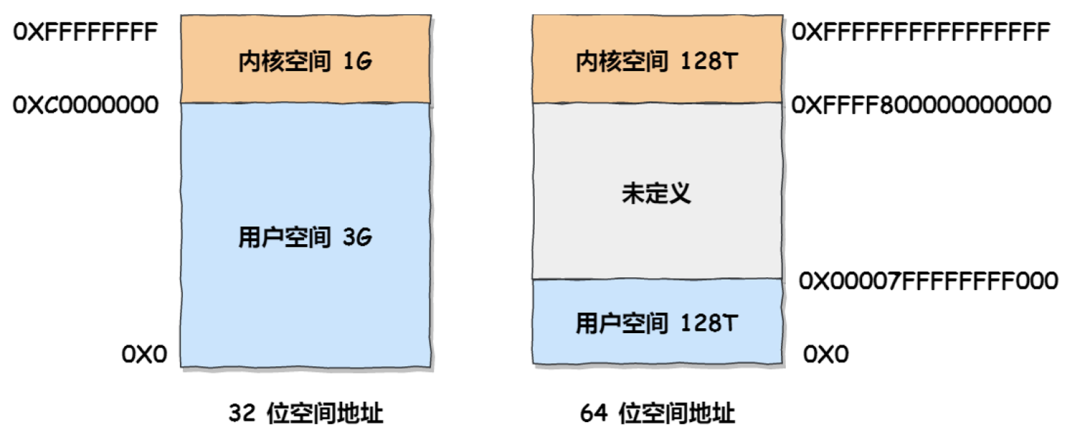 32 位系统的内核空间占用 1G,位于最高处,剩下的 3G 是用户空间; 64 位系统的内核空间和用户空间都是 128T,分别占据整个内存空间的最高和最低处,剩下的中间部分是未定义的。