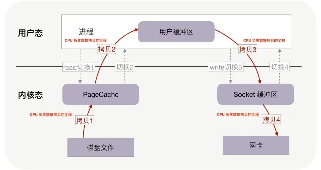 read 系统调用读磁盘上的文件时:用户态切换到内核态; read 系统调用完毕:内核态切换回用户态; write 系统调用写到socket时:用户态切换到内核态; write 系统调用完毕:内核态切换回用户态。