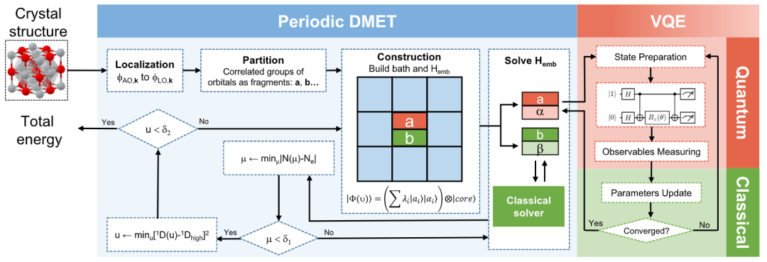 图 1:基于周期性密度矩阵嵌入理论的量子-经典混合算法流程图。