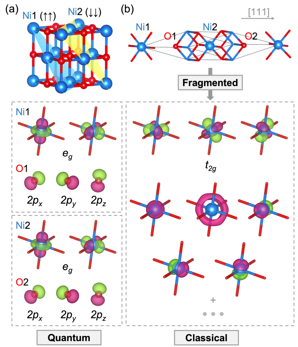 在1维的氢链研究中,作者采用整个原胞当作片段(即图2中的a或b),重点展示了非限制的幺正耦合簇拟设态 (Unrestricted Unitary Coupled-Cluster Ansatz) 的能力。在2维的六角硼氮层 (h-BN) 研究中,作者将单个原胞进行多片段划分,并得到和理论符合预期的结果,验证了在轨道尺度进行多片段划分的有效性。在3维的强相关过渡金属氧化物氧化镍 (NiO) 中,作者采用了在轨道尺度进行多片段划分方法和非限制的幺正耦合簇拟设态来系统地研究NiO的磁序,并得到合理的能量间隙。其中,为了模拟NiO的AFII和FM态,作者采用了每个单胞包含2个化学式单位的斜方晶体结构。Ni原子简并的3d轨道会在NiO固体中的正六面体晶体场的作用下劈裂为半充满的 和全充满的 两组轨道,进而作者将NiO单胞划分为三个片段,前两个片段分别包含一个Ni原子的 轨道和邻接O原子的2p轨道,并用量子计算机来处理这两部分;剩下的所有轨道都放入第三个片段,用经典计算机来处理。