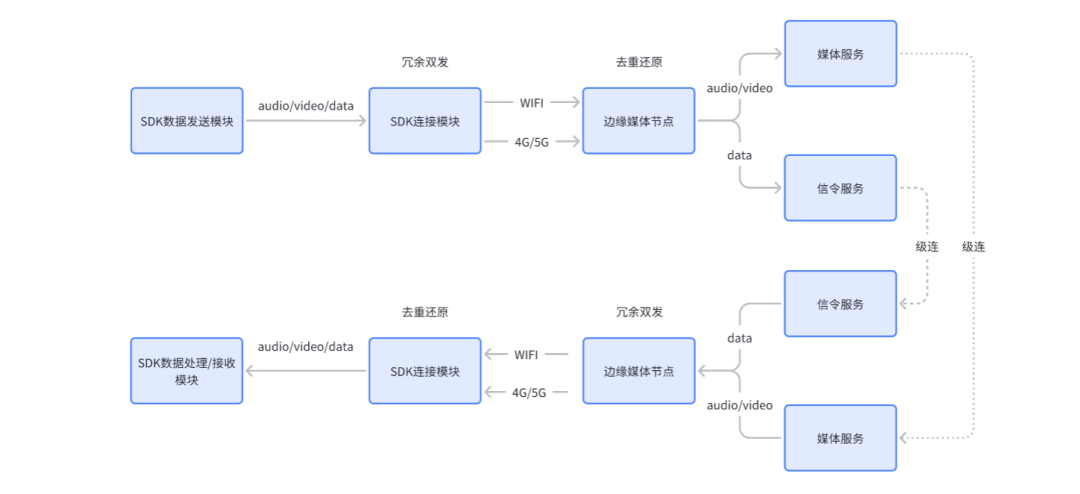 架构设计上,完全冗余传输只存在于 SDK 连接模块和边缘媒体节点之间。在发送端,SDK 传输模块负责把上层的数据进行冗余,并通过两个通道同时发送出去,边缘媒体节点负责在接收到数据时,把数据进行去重还原,然后交给上层的服务。在接收端,边缘媒体节点负责对数据进行冗余发送,而 SDK 传输模块则负责对接收数据进行去重和还原,并把数据交给上层模块。