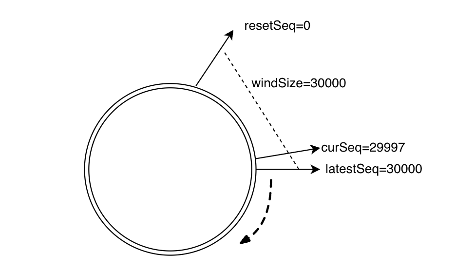 如上图,resetSeq 为窗口最左端值,latestSeq 为窗口最右端值,resetSeq 到 latestSeq 之间为有效判断窗口,即windowSize,设置为 30000。当模块收到一个包时,记此包 seqNum 为 curSeq,做如下处理: