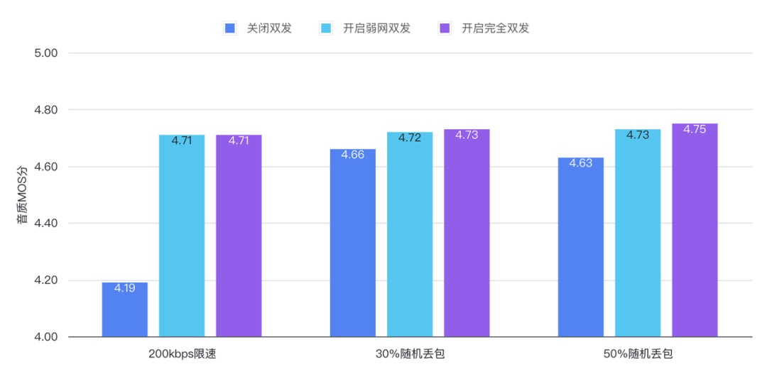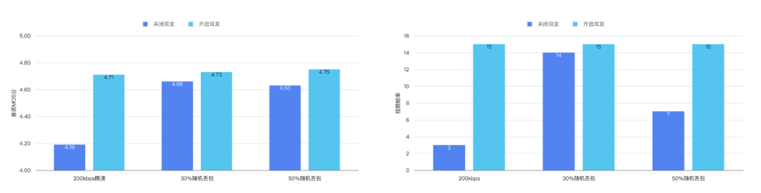 如上图,开启完全双发后,音质(MOS 分)、画质(视频帧率)在不同弱网环境下的表现稳定,音质、画质基本不受弱网影响。关闭完全双发后,音质、画质会随着弱网场景的不同受到不同程度的影响,特别是在 200kbps 限速时,音质、画质下降严重。