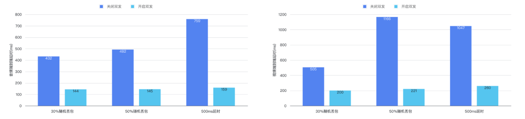 如上图,开启完全双发后,端到端延时在不同弱网环境下的表现良好且稳定,基本不受弱网影响。关闭完全双发后,当出现高丢包、高延时弱网时,端到端延时明显增加,用户体验明显下降。