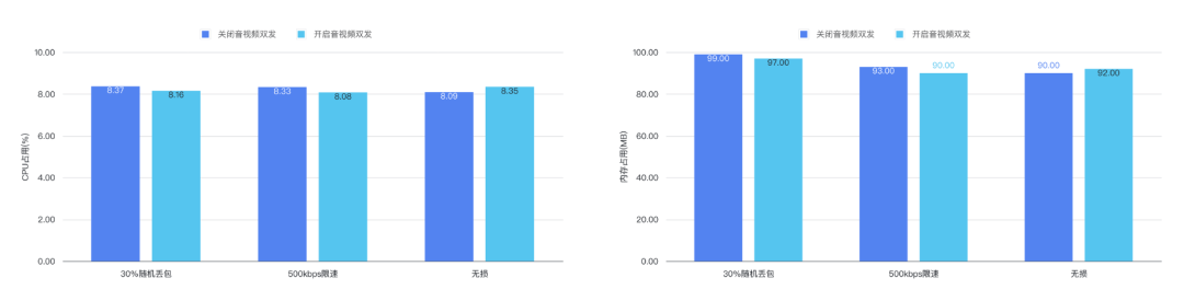 在各种网络环境下,开启或关闭完全双发对 CPU 和内存的消耗没有太大差别。