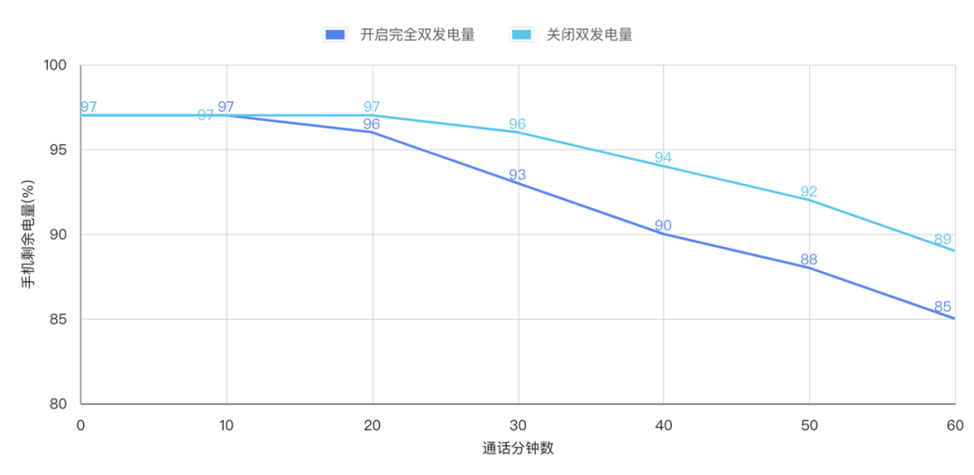 我们使用同款手机进行持续的音视频通话,开启完全双发比关闭双发消耗的电量更多、更快,在通话 1 小时后,开启双发比关闭双发多消耗了 4% 的电量。