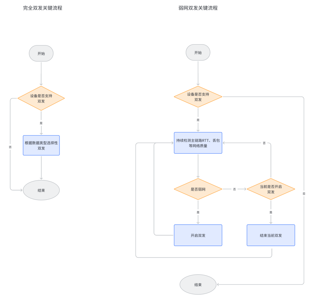 弱网双发使用的多径协议、去重算法和完全双发基本相同,不同点主要在于,弱网双发在完全双发的基础上添加了弱网条件的判断,只有当检测到主链路发生弱网时系统才会开启双发(使用移动网络发送数据),否则不开启,这样既保证了正常网络下不额外消耗流量和电量,又做到了弱网下提升用户体验。
