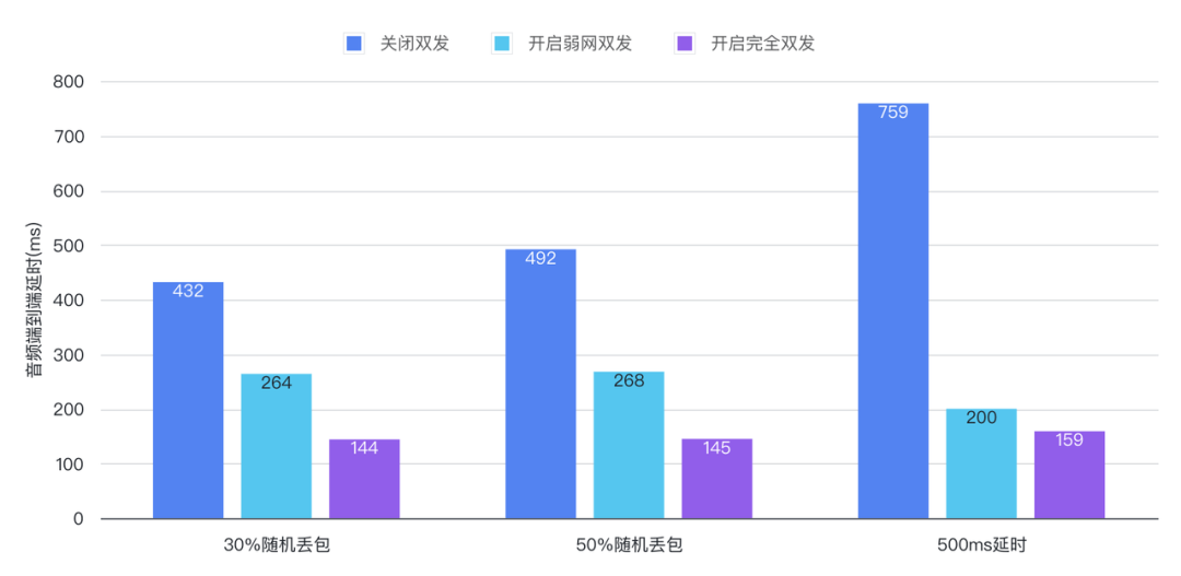 整体来看,当开启完全双发后,单个路径的弱网对整体音画质、端到端延时表现基本没有影响,用户仍然能获得高质量的音视频通话体验;关闭完全双发后,单个路径的弱网会导致明显的卡顿和延时问题。