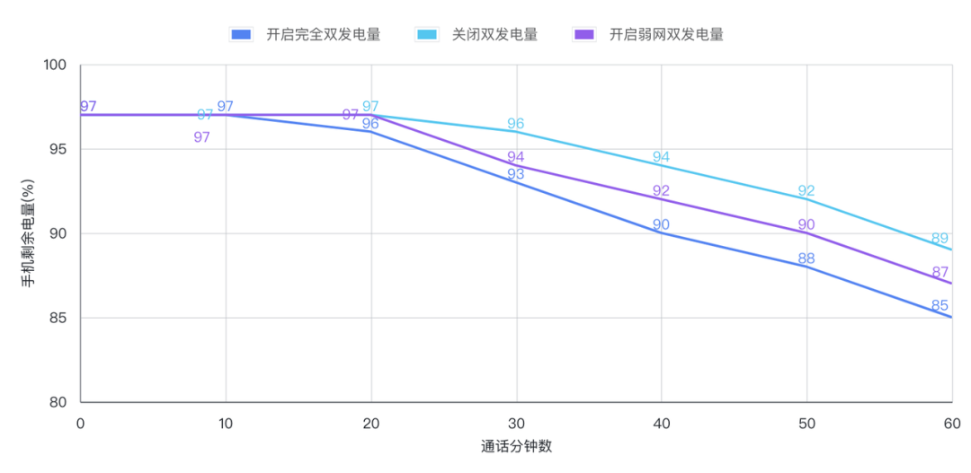 测试结果显示,开启完全双发会对设备功耗造成一定影响,增加通话的电量消耗。