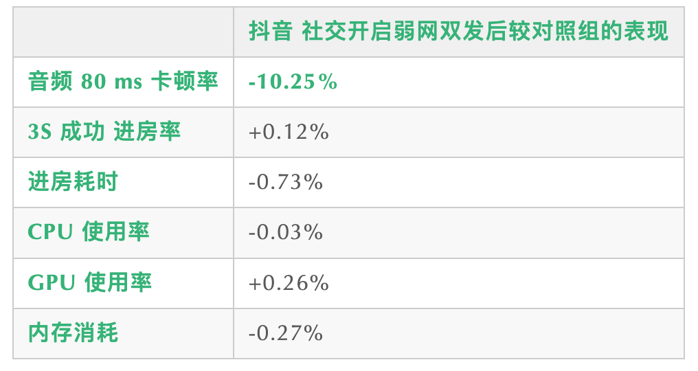 目前,弱网双发已经在飞书会议、抖音社交等业务上线,以下是抖音社交业务开启弱网双发后较对照组的表现: