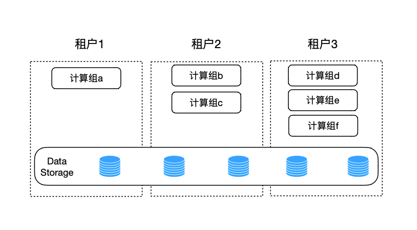 ByConity支持不同的租户使用不同的计算资源,如图5 所示。在 ByConity 新的架构下,很容易实现了多租户隔离和读写分离等特性。不同租户可以使用不同的计算组,实现多租户隔离,同时支持读写分离。由于扩缩容方便,计算组可以按需进行动态的扩缩容,保证资源利用率高效。当资源利用率不高时,可以进行资源共享,借调计算组给其他租户使用,实现资源的最大化利用并降低成本。