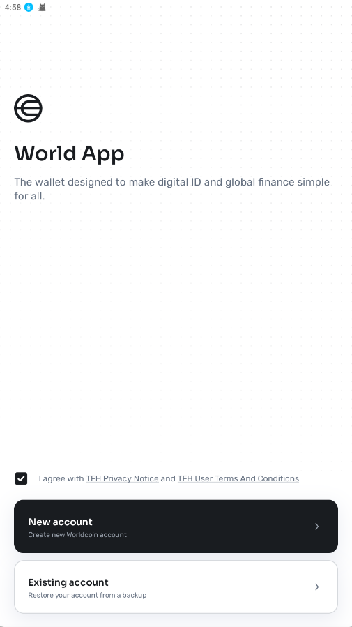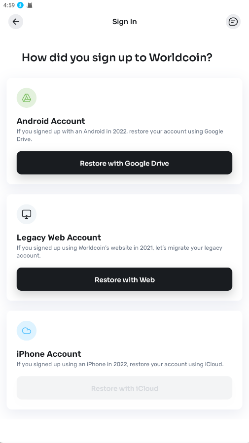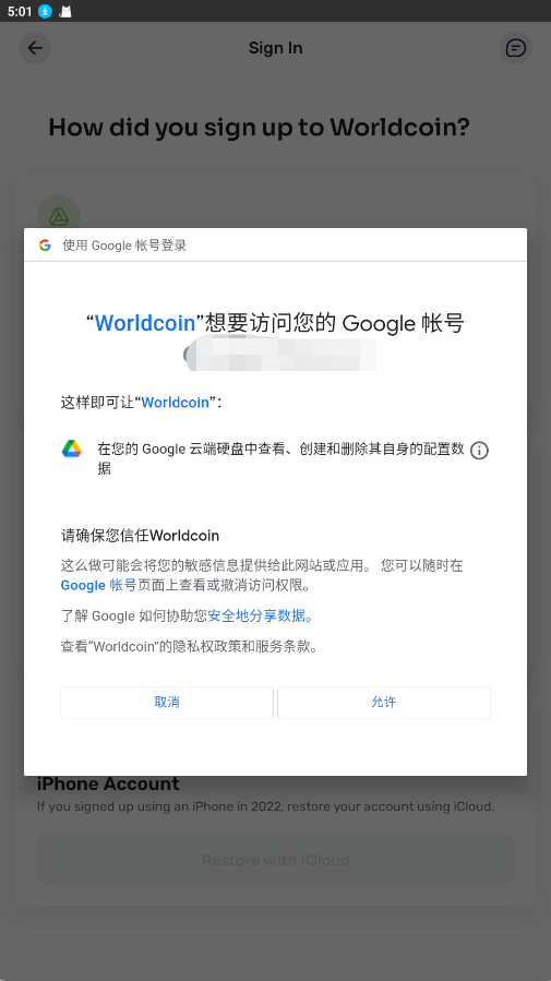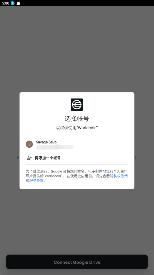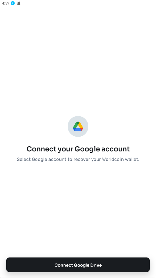Existing account→restore with Google drive →connect Google drive→选择你刚才登录的谷歌账号→允许worldcoin访问谷歌账号→输入 worldcoin的登陆密码