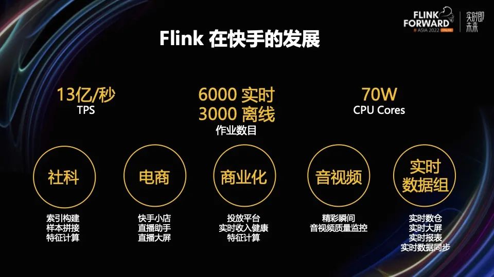 在快手内部,Flink 的体量无论从作业规模还是集群规模上,相对于去年都有大幅的提升,上图列了几个关键数据。峰值的 TPS 达到了每秒 13 亿,作业数量上流作业有 6000 多个,批作业也到了 3000 个,物理资源上已经有 70 万 Cores。在业务场景的覆盖上,Flink 给公司的各个业务方,包括社科、电商、商业化、音视频、实时数仓都提供了实时计算能力。