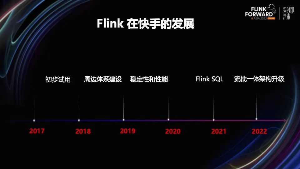 2017 年快手内部为了满足直播、短视频实时质量监控的需求,初步引入了 Flink 引擎,后面几年陆续建立了周边体系,提高稳定性和性能,把 Flink 推广到公司的各个业务线。