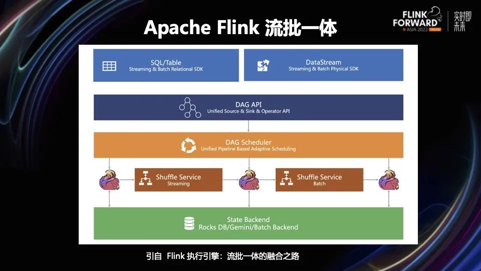 更智能的引擎,提高用户体验。不需要用户了解流模式和批模式是什么,也不需要用户操心应该选择哪种执行模式、Shuffle 方式、调度器等底层细节。