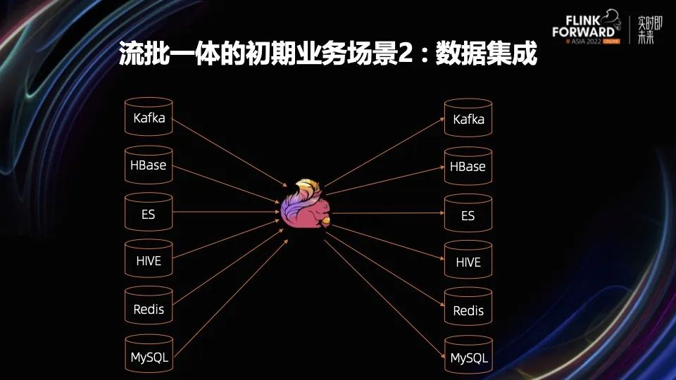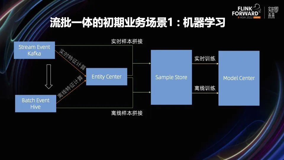 我们最早收到的流批一体的诉求来源于两个内部业务,机器学习和数据集成。机器学习场景一直是我们内部 Flink Streaming 的重点业务方,他们用 Flink 做实时特征计算和实时样本拼接。他们希望能够用 Flink Batch 复用一套业务逻辑,来满足回溯的需求,做数据修正和冷启动生成历史数据。而且用一个引擎也可以避免结果不一致的问题。