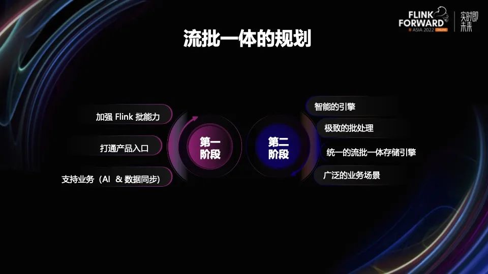 第一个阶段的目标是支持好目前对流批一体有需求的两个业务方,提供统一的用户体验和计算引擎,让用户先能用起来。规划的重点是加强 Flink 的批能力,打通产品入口以及给业务进行贴身的支持。