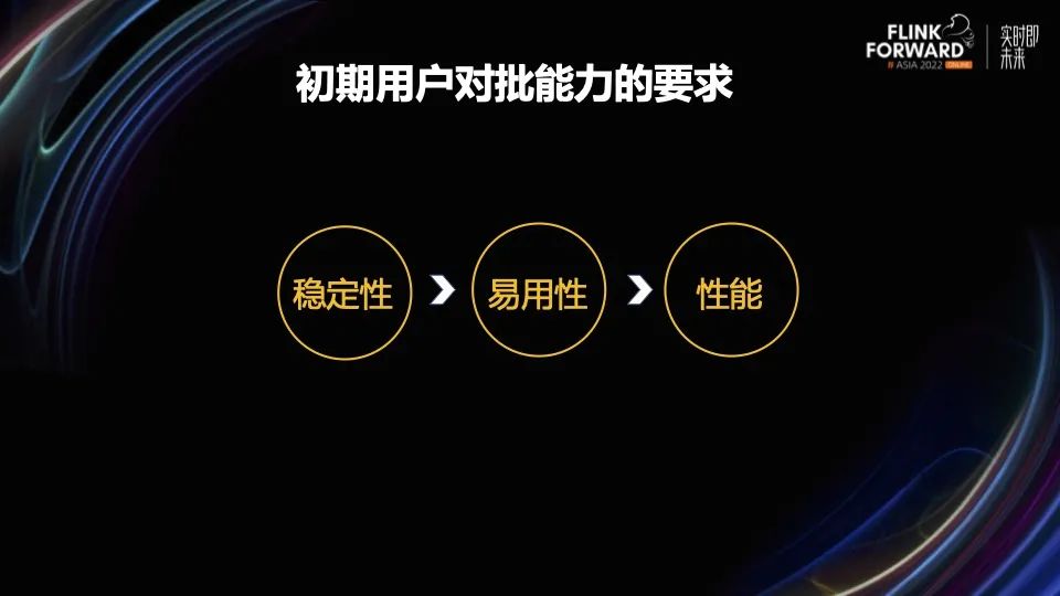 我们第一期的用户来源于机器学习场景和数据同步场景。用户对批能力的需求,总结起来,稳定性是生产可用的必要条件,另外也希望在易用性上有所提升,对性能和功能的要求在这个阶段相对弱化一些,希望大部分 pattern 下没有明显性能回退就可以。所以在第一阶段加强能力建设上,我们内部的重心集中在稳定性和易用性上,这也是我今天重点分享的内容,补充一点,其实在性能上我们也在 Hive 的 Source/Sink 上也做了优化,感兴趣的听众可以关注 生产实践专场《Hive SQL 迁移 Flink SQL 在快手的实践》这个分享。