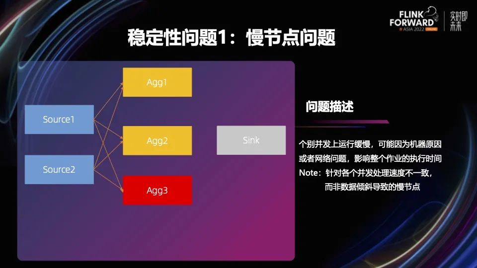 慢节点问题。在一个分布式系统里,个别的机器故障、资源紧张或者是网络问题都可能导致单个并发的性能下降,这些慢的节点可能成为整个作业的瓶颈。