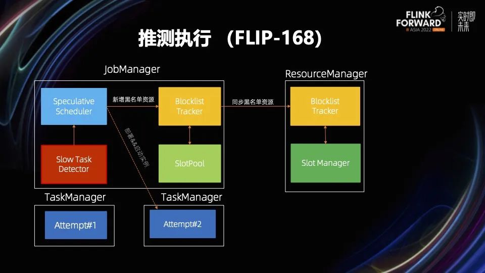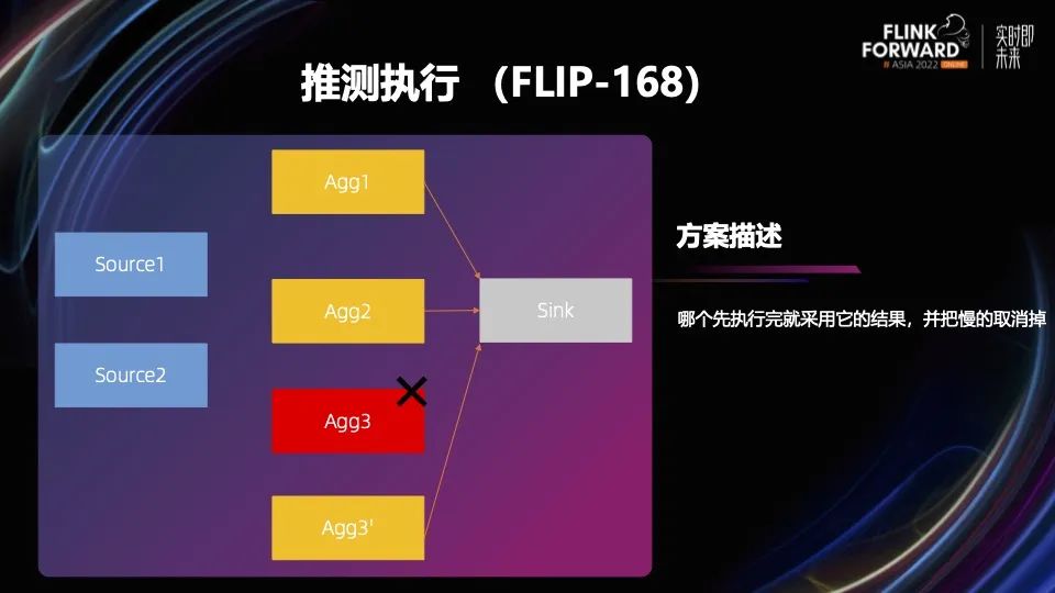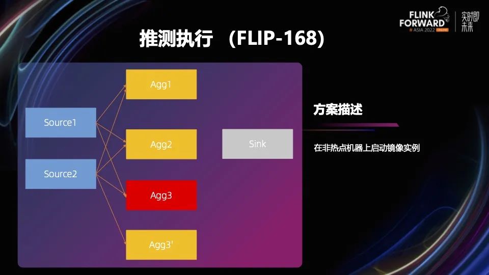 所以 Flink 引入推测执行来解决慢节点的问题,和传统 MapReduce、Spark 的思路类似。检测到长尾任务后,在非热的机器上部署长尾任务的镜像实例。如上图所示,第三个聚合的 worker 在另外一个机器上拉起了一个镜像实例,即 Agg3’。这两个哪个先执行完就用哪个结果,并把其他的取消掉。