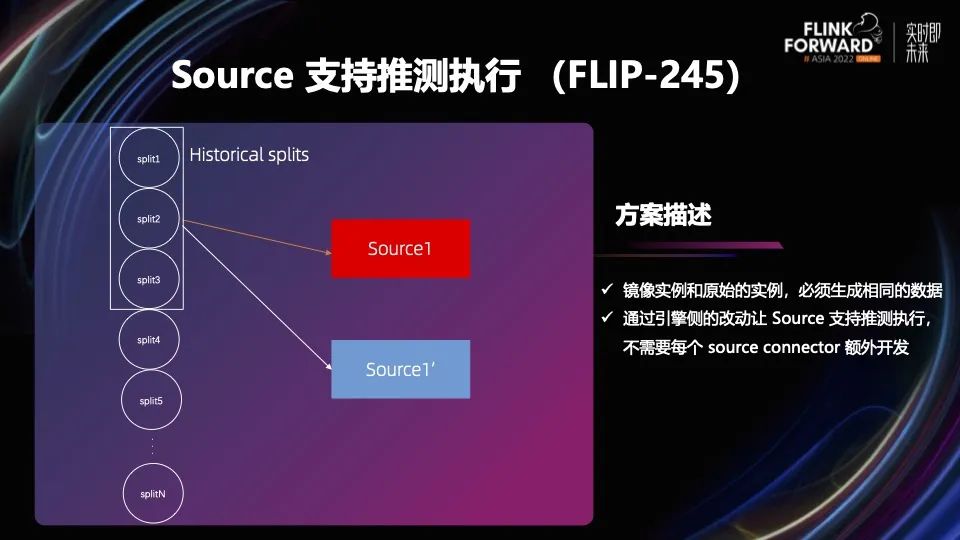 除了框架层面,还需要 connector 支持推测执行。我们对 Source 支持推测执行的目标是通过框架层的改动,不需要每个 Source 有额外的开发。在 Flink 里 Source Task 和数据分片的分配关系,不是编译期间就固定好的,而是在运行的时候,每个 Task 处理完一个分片后再去申请下一个分片。