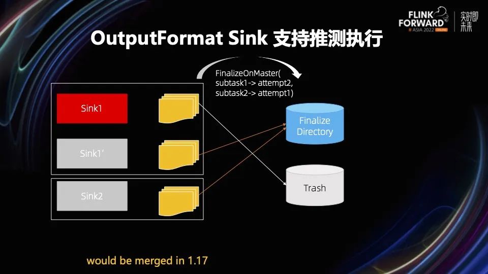 另外,我们还修改了 FileSystemOutputFormat 对临时文件的组织方式,在文件组织目录里加了实例信息。在所有的并发完成后,每个 subtask 里最快执行完的实例,所产生的临时文件才会被挪到正式目录下,其他慢实例产生的文件会被删除。因为时间关系,Sink 支持推测执行没来得及进入 1.16 版本,会在 1.17 版本发布。到时不仅会支持 OutputFormat Sink,也会支持 FLIP-143 引入的 New Sink。