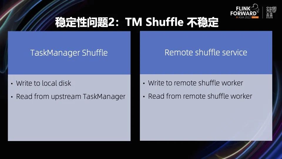 TaskManager Shuffle 不稳定。之前采用的 Native TaskManager Shuffle 方式,Shuffle 服务不稳定。