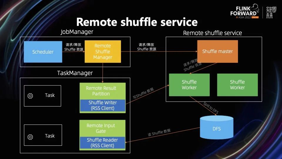 第二种是 Remote Shuffle Service,它通过单独的集群提供数据的 Shuffle 服务,可以避免 TaskManager Shuffle 的资源利用率低和容错开销大的问题,而且它是一种拥抱云原生实现存算分离的方案。