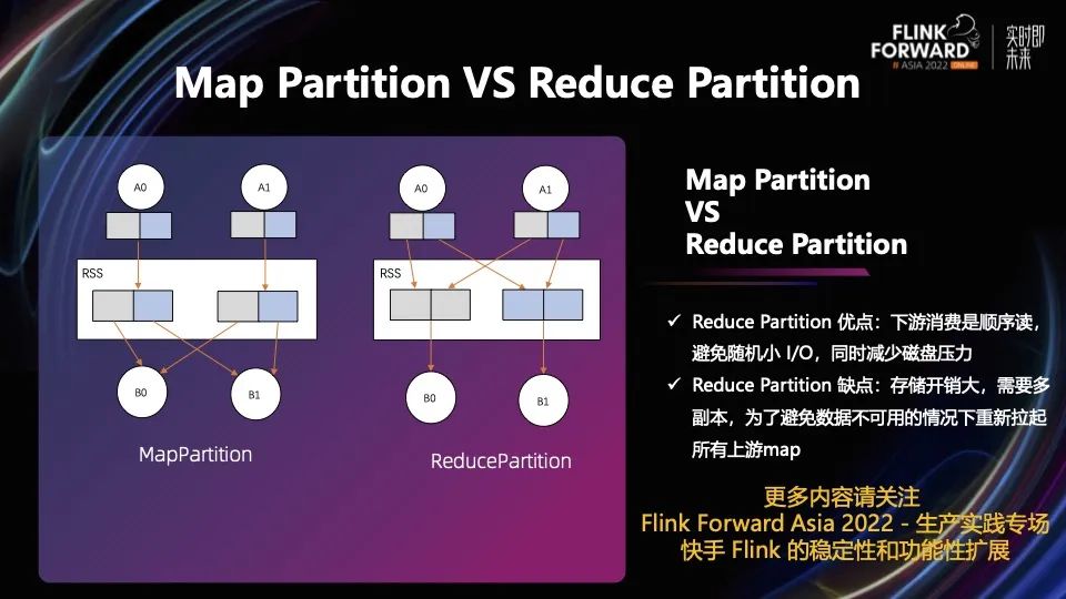 Map Partition 里的数据由一个上游任务产生,可能会被多个下游任务消费。而 Reduce Partition 的数据由多个上游计算任务输出,只会被一个下游并发消费。
