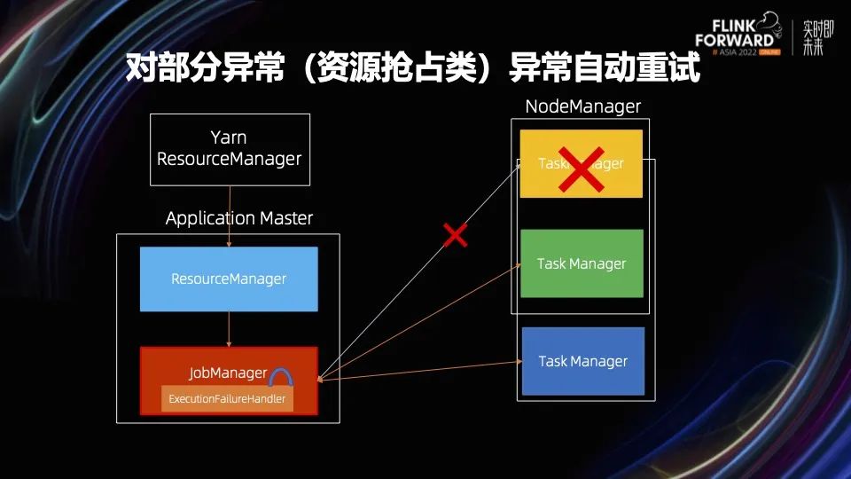 对于第一个问题,引擎需要区分资源抢占类导致的失败和其他业务异常导致的失败。对资源抢占类的异常由框架自动重试,不计入失败重启次数。上图反映了内部的实现细节需要做两个改动,第一个是 YarnResourceManager 把 container 退出码告诉 AM,第二个是 ExecutionFailureHandler 识别每次失败的原因,主动跳过一些指定类型的异常,不计入失败重启次数。