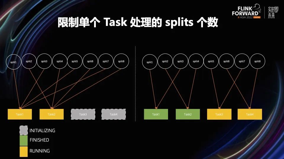 为了不让 failover 的代价过大,我们对单个 task 最多能处理的 splits 做了限制,一旦一个 task 处理 splits 的数目达到阈值,这个 task 就主动的退出,将剩下 splits 交给后面 task 来处理。