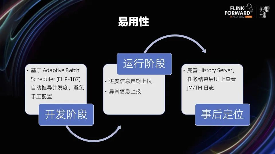 第三个是在事后定位阶段,批作业和流作业不同,因为很多用户都是在作业失败或者结果不符的时候,才会关注这个作业,但这个时候作业很可能已经执行完了,所以我们完善了 history server ,在用户结束以后,也可以让用户在 UI 上查看 JM 和 TM 的日志。