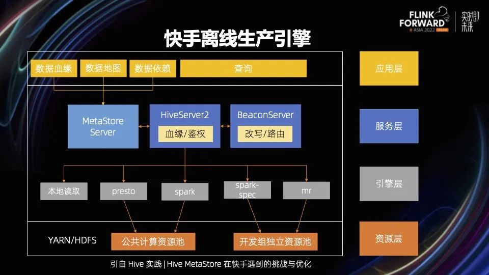 上图展示的是快手的离线生产引擎架构,我们所有的离线 SQL 生产作业,都采用 Hive,且以 HiveServer 作为统一的入口。从图中可以看到有一个 BeaconServer 组件,它用来承载智能路由的功能。根据一定的规则,把 SQL 作业路由到底层的引擎上。底层目前已经对接 spark、mr 和 presto 的引擎。