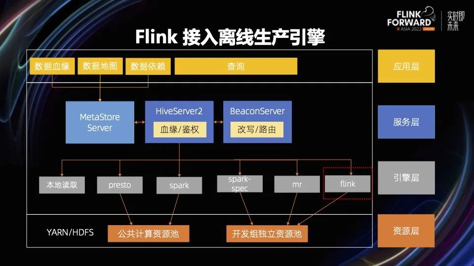 我们在支持流批一体业务的同时,也在思考如何大规模落地 Flink 批。很多业务其实也有流批一体的需求,但还在观望,担心 Flink Batch 的普适性是否适合其他 pattern,是否适合其他的业务场景,而我们自己也需要一个方法来论证和事先来评估。所以我们内部把 Flink Batch 接入离线的生产引擎,让 Flink Batch 也可以承接线上的离线作业。