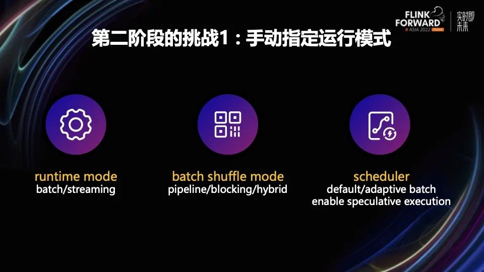 第一个挑战是手动指定运行模式。比如指定作业运行模式、交互方式、是否开启推测执行等等。这些都需要用户知道很多底层的细节,才能判断自己需要哪些参数,以及怎么合理的来设置这些参数。