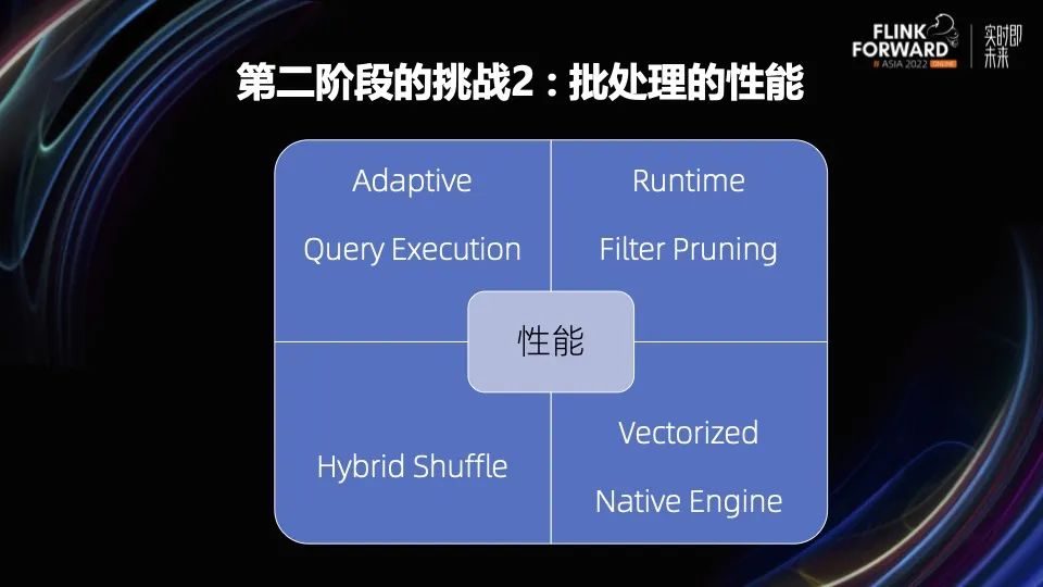 第二个挑战是批处理的性能。而 Flink 批要想有更广阔的业务场景,要在性能上有更大的突破。Flink 社区在刚发布的 1.16 版本也已经开启了好几个 FLIP,希望把 Flink Batch 的性能在往前走一步。
