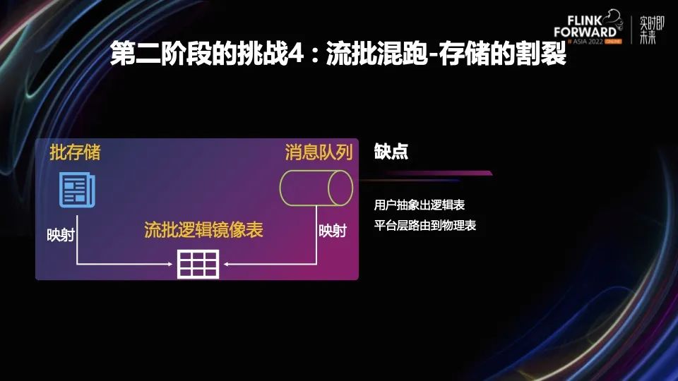 流批混跑第二个挑战是存储的割裂。虽然业务代码可以用统一的计算引擎来表达,但存储还是不一样。流模式一般用 Kafka 消息队列来做 Source 和 Sink,批作业一般用 Hive 或者 DFS 文件做 Source 和 Sink。存储的割裂造成的结果就是把复杂性留给了用户和平台。用户需要抽象出逻辑表,指定逻辑表和底层物理表映射关系,平台层根据执行模式把逻辑表路由到底层的物理表上,引入统一的流批一体存储已经成为必不可少的一个环节。Flink 社区在去年提出了 Flink Table Store,它是一种流批一体的存储设计,既能支持流写流读,也能支持批写批读,在存储上屏蔽了流和批的差异。