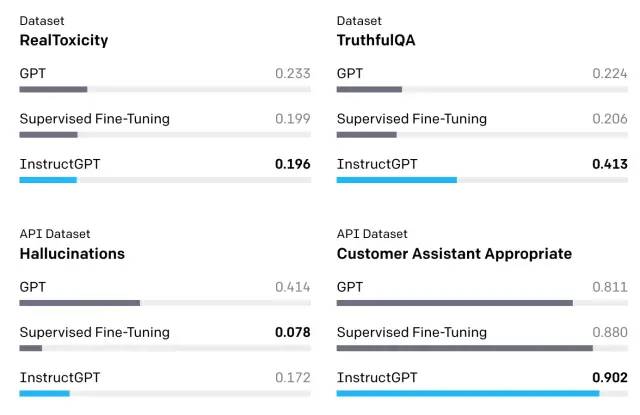GPT3只是个语言模型,它被用来预测下一个单词,丝毫没有考虑用户想要的答案;当使用代表用户喜好的三类人工标注为微调数据后,1.3B参数的InstructGPT在多场景下的效果超越175B的GPT3。