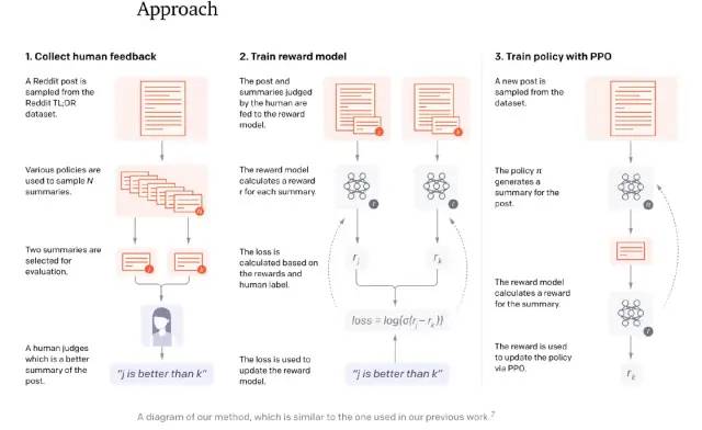 再往前回溯,其实在2019年GPT2出世后,OpenAI就有尝试结合GPT-2和强化学习。在NeurIPS 2020的Learning to Summarize with Human Feedback工作中,OpenAI在摘要生成中,利用了从人类反馈中的强化学习来训练。可以从这篇工作的整体流程图中,看出三步走的核心思想:收集反馈数据 -> 训练奖励模型 -> PPO强化学习。