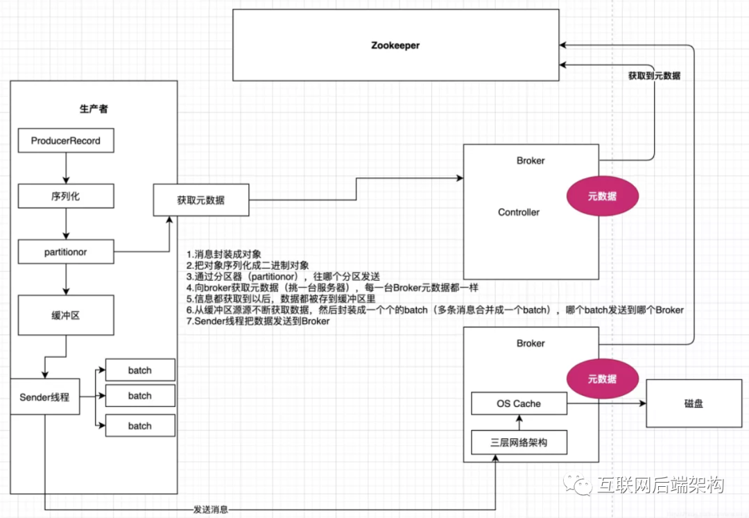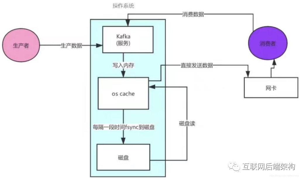 消费者读取数据流程:\1. 消费者发送请求给kafka服务 2.kafka服务去os cache缓存读取数据(缓存没有就去磁盘读取数据) 3.从磁盘读取了数据到os cache缓存中 4.os cache复制数据到kafka应用程序中 5.kafka将数据(复制)发送到socket cache中 6.socket cache通过网卡传输给消费者