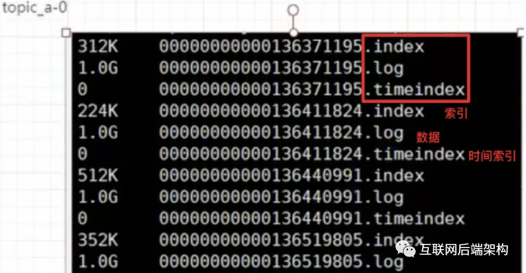 Kafka中一个主题,一般会设置分区;比如创建了一个topic_a,然后创建的时候指定了这个主题有三个分区。其实在三台服务器上,会创建三个目录。服务器1(kafka1):创建目录topic_a-0: 目录下面是我们文件(存储数据),kafka数据就是message,数据存储在log文件里 .log结尾的就是日志文件,在kafka中把数据文件就叫做日志文件。一个分区下面默认有n多个日志文件(分段存储),一个日志文件默认1G