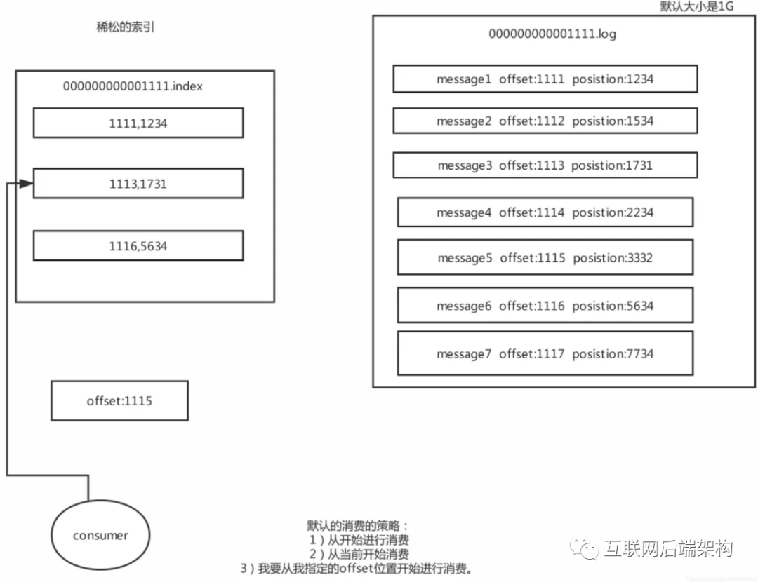 Kafka里面每一条消息,都有自己的offset(相对偏移量),存在物理磁盘上面,在position Position:物理位置(磁盘上面哪个地方) 也就是说一条消息就有两个位置:offset:相对偏移量(相对位置) position:磁盘物理位置 稀疏索引:Kafka中采用了稀疏索引的方式读取索引,kafka每当写入了4k大小的日志(.log),就往index里写入一个记录索引。其中会采用二分查找