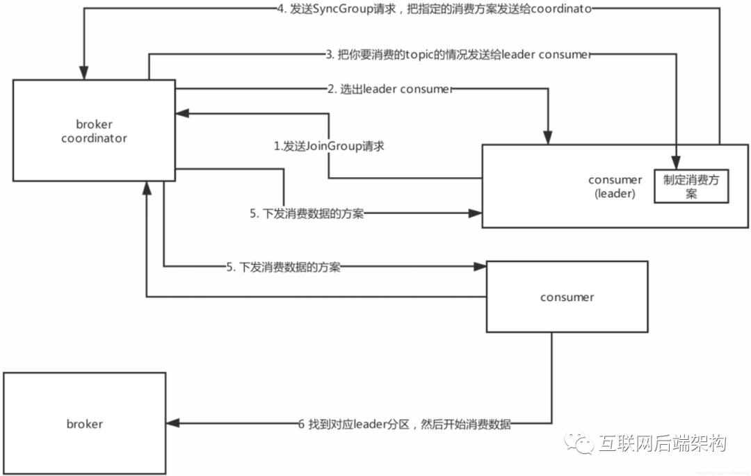 运行流程 1)每个consumer都发送JoinGroup请求到Coordinator, 2)然后Coordinator从一个consumer group中选择一个consumer作为leader, 3)把consumer group情况发送给这个leader, 4)接着这个leader会负责制定消费方案, 5)通过SyncGroup发给Coordinator 6)接着Coordinator就把消费方案下发给各个consumer,他们会从指定的分区的 leader broker开始进行socket连接以及消费消息