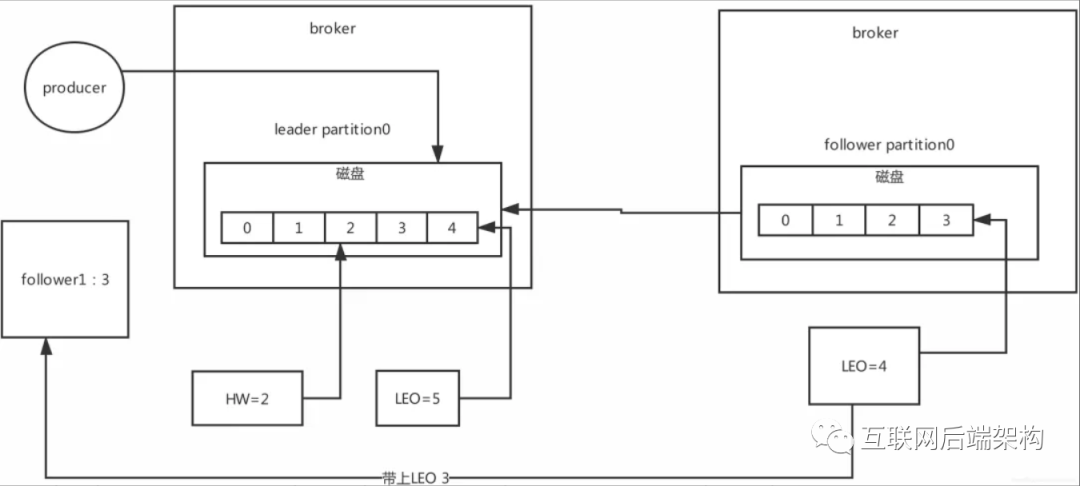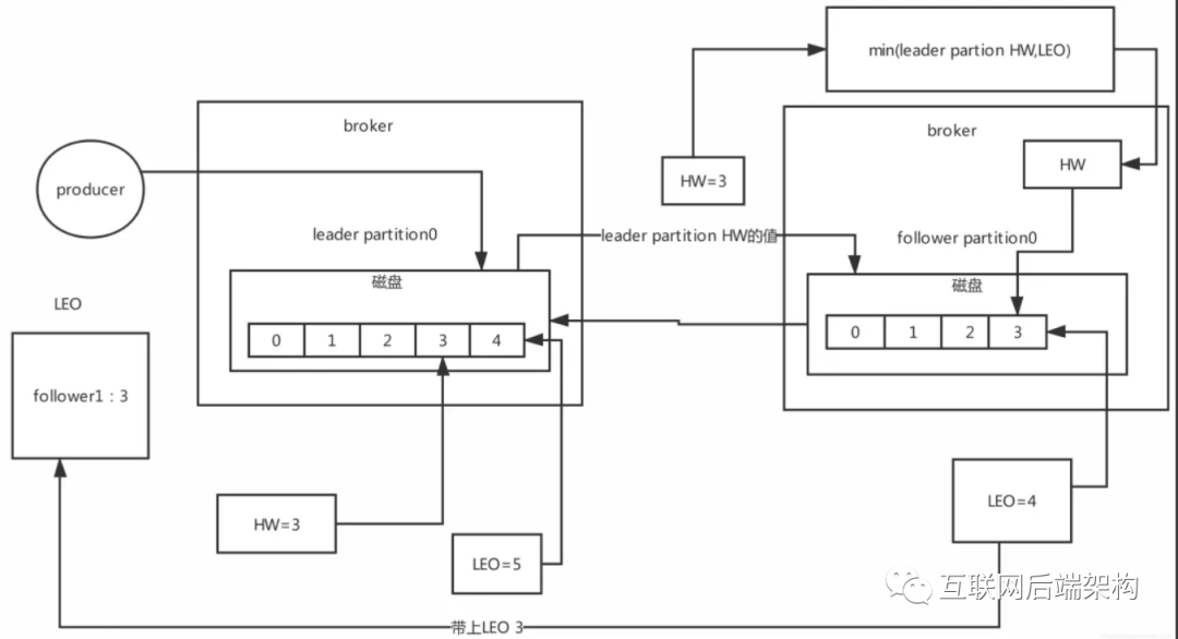 每次partition接收到一条消息,都会更新自己的LEO,也就是log end offset,LEO其实就是最新的offset + 1