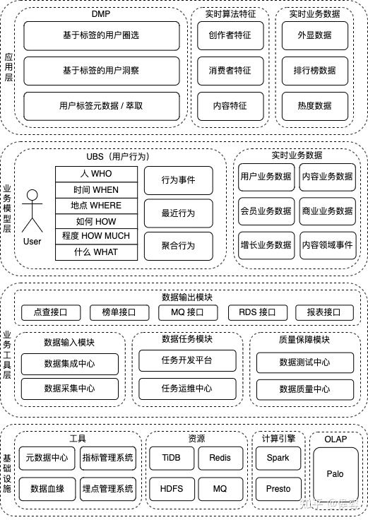 自上而下的拆分了实时数据和用户画像的能力,分为应用层、业务模型层、业务工具层和基础设施层。通过组织划分,明确了不同层次的边界和加速了业务目标的达成。