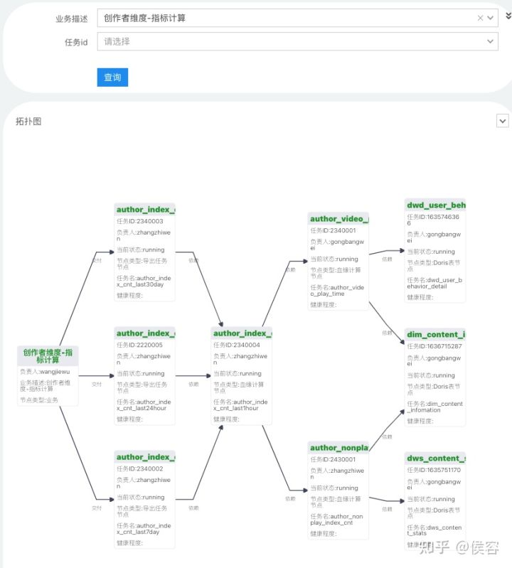 以通过 DQC 监控的某一个业务的健康情况,该业务由多个导出任务和中间计算任务及部分数据源组成,当前情况是一切正常。期间如果出现某节点任意异常后,都可及时发现。