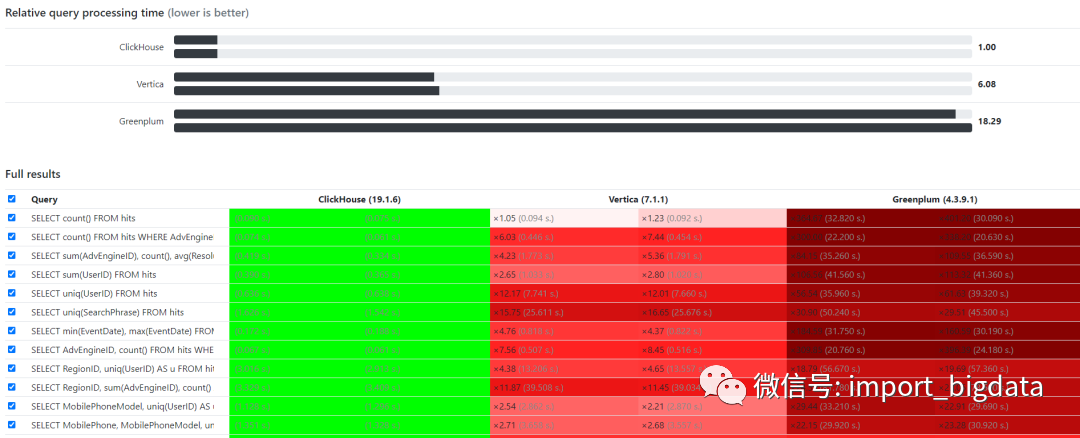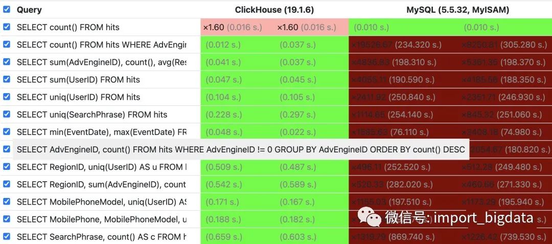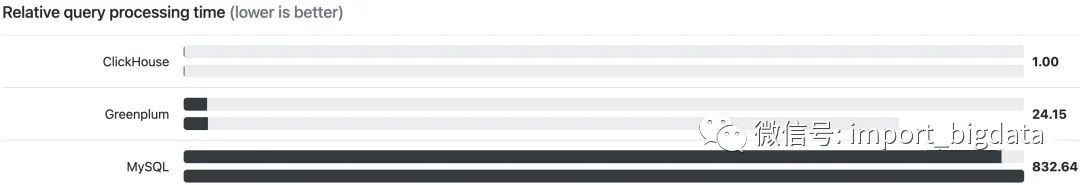 基于以上特点,ClickHouse 在包含 count、sum、group by、order by 等情况的查询对比,同等条件下,ClickHouse 的查询性能异常强悍,官网上的数据显示,是同等条件下 MySQL 的 831 倍。