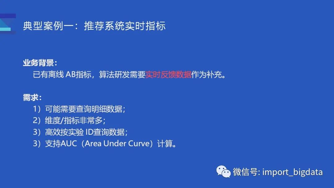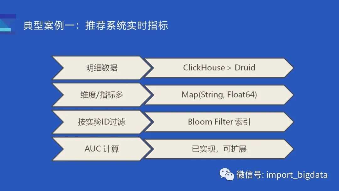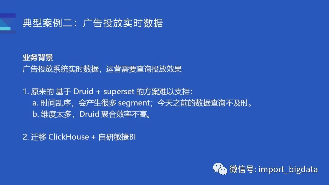 第二个典型案例是关于广告的投放数据,一般是运营同学需要查看广告投放的实时效果。由于业务的特点,当天产生的数据往往会涉及到多天的数据。这套系统原来基于 Druid + Superset 实现的,Druid 在这个场景会有一些难点: