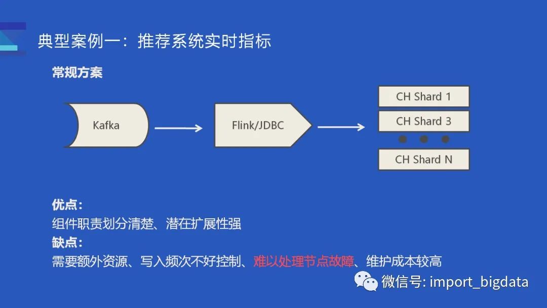 关键是后面两点:由于缺少事务的支持,实时导入数据时难以处理节点故障;ClickHouse 组技术栈以 C++为主,维护 Flink 潜在的成本比较高。